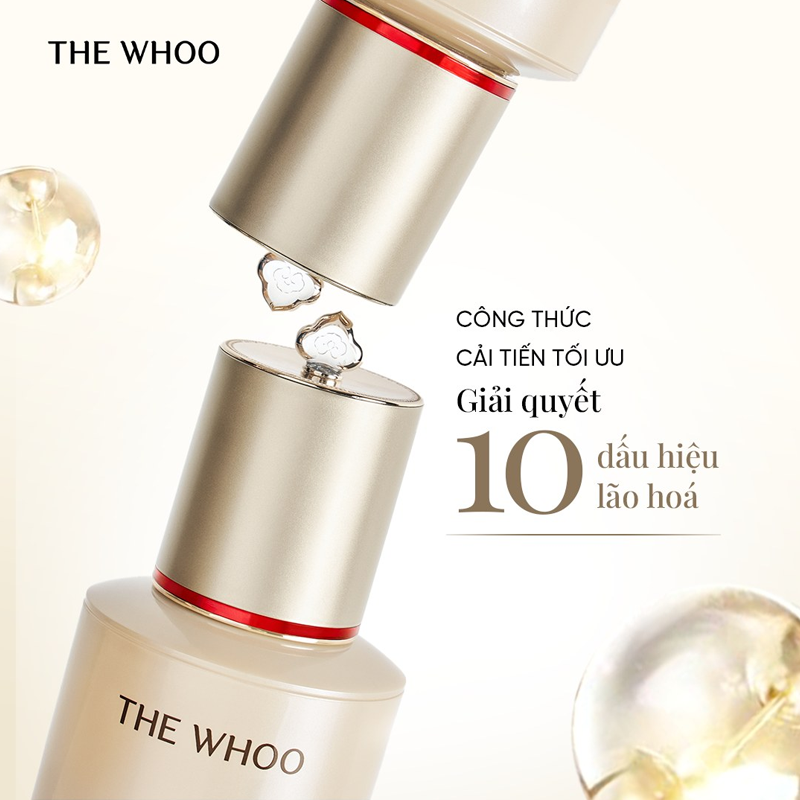 Sản phẩm được thiết kế sang trọng với chai thủy tinh ánh vàng ngọc trai kết hợp hoa văn tinh xảo hoàng cung. Nắp vàng ánh kim đi kèm họa tiết vương miện đỏ tạo cảm giác quyền quý. Thân chai in logo và tên sản phẩm rõ nét, kèm hướng dẫn sử dụng chi tiết phía sau, giúp người dùng dễ dàng tiếp cận. Bao bì chắc chắn, thể hiện đúng tinh thần “mỹ phẩm hoàng cung” mà Whoo theo đuổi.